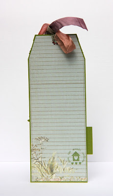 Основа тэга - зелёный кардсток. Бумага - Prima Marketing (на "фасад" пошел листочек из мини-набора Romantique, оборот оформлен линованной бумагой из коллекции Ledger). Оконная рама - это чипборд из ассорти "