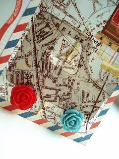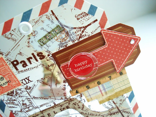 Сам тег вырезала из прозрачного оверлея с рисунком карты. Сделала для него "рамку" из листа с почтовым принтом. С обратной стороны прозрачного тега приклеила чипборд машинка из набора